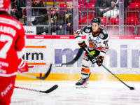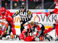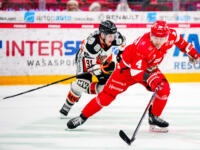 Sport #91 Sebastian Wännström gets snake-tongued by HPK #30 Sami Rajaniemi.