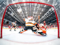 HPK #41 Antti Pihlström hits post behind Sport #95 Miroslav Svoboda.