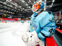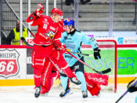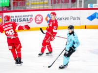 Sport #53 Aatu Aarnio hits the net. Sport #21 Miro Nalli on mask in front of Pelicans #70 Jasper Patrikainen.